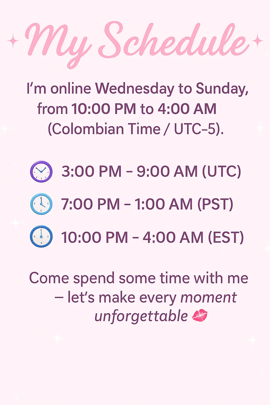 I want this space to feel cozy, sweet and full of good energy, so here are a few gentle rules to make our time together even nicer: Please be kind and respectful — I’m here to make you feel good, not to deal with negativity. No demands or spam, let things flow naturally and enjoy the moment with me. Respect my limits and the pace of the show; I’ll always give you my best when I feel comfortable. I love talking more than typing, so if you can, please keep your audio on. I speak and understand English, so feel free to talk to me on chat. Good vibes, soft energy and sweet moments make everything so much more fun for both of us. ✨ Thank you for making this room a warm, safe and happy place. 💗