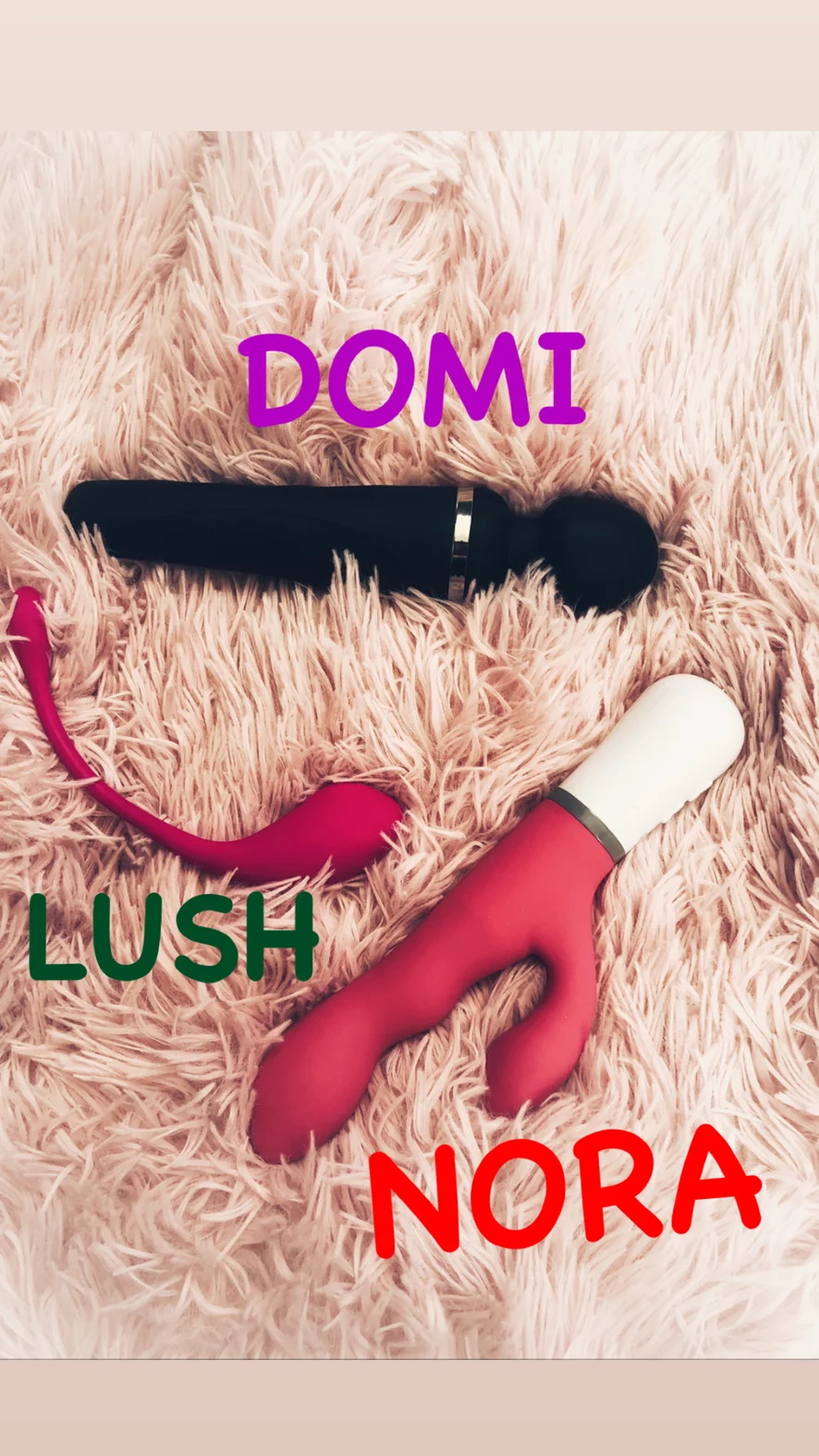 I decided that you would be interested to know more about my interactive toys! So, I have 3 such toys, these are: -DOMI -LUSH -NORA The principle of all toys is the same - they all vibrate for your tip! but the shape is different for everyone, which radically changes the feeling! Lush is almost always in me, since it is most convenient to move, walk, stand with him! HE vibrates from inside me, which makes me wet -DOMI: this thing doesn't go inside, only the tip is possible! It teases my clit and makes me very hard! This thing is very strong and can make me cum in a few minutes! _NORA: this toy vibrates from the inside, makes circular movements