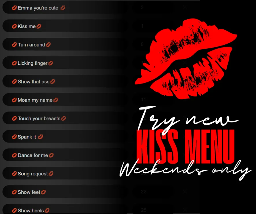 Flashing, Heels, Topless, Twerk, Upskirt, Erotic Dance, Pinch Nipples, Striptease, Tittyfuck, Spanking, Camel Toe, Dirty Talk, Dildo or Vibrator, Fingering, Blowjob, Oil Show, Sex Toys, Nipple Toys, Lovense Free Control 5min, Cock Rating, Facesitting, Deepthroat, Humiliation, Jerk-off Instruction, Role Play, Orgasm, Squirt, Hardcore