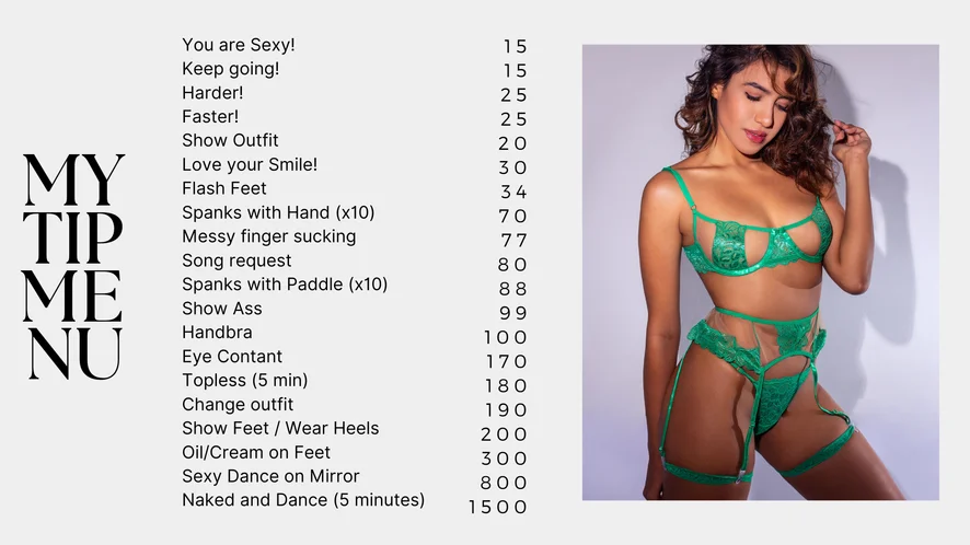 Camel Toe, Foot Fetish, Erotic Dance, Topless, Twerk, Oil Show, Cock Rating, Fingering, Sex Toys, Nipple Toys, Blowjob, Masturbation, Heels, Flashing, Doggy Style, Cowgirl, Squirt, Hardcore, Orgasm, Tittyfuck, Dildo or Vibrator