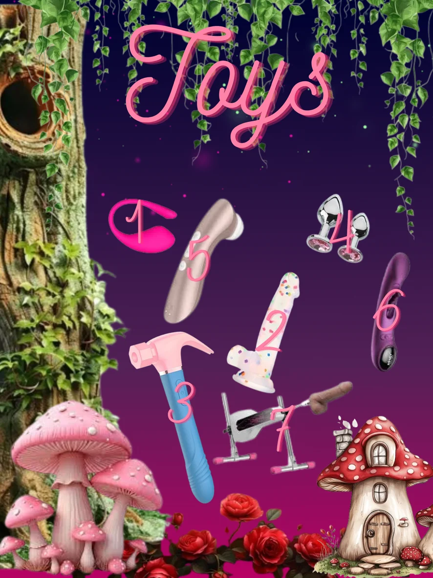 1. Lovense Lush 2. Confetti dildo 7.3 inch 3. Hammer (clit suction, thrusts, licking functions) 4. Butt plugs (1.2 in, 1.5 in) 5. Satisfyer pro 2 (clit suction) 6. Hone play box temp (vibe dildo with flicker) 7. Lovense mini sex machine