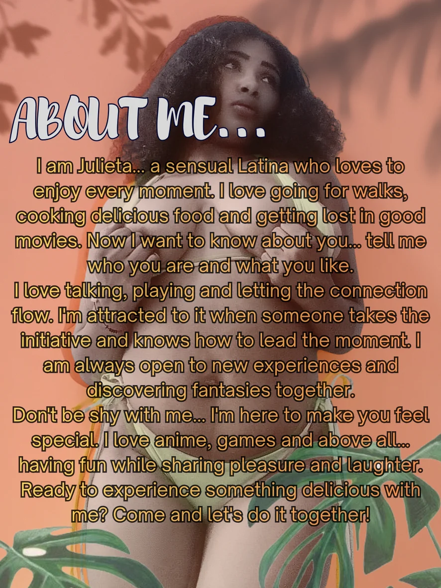 I am Julieta... a sensual Latina who loves to enjoy every moment. I love going for walks, cooking delicious food and getting lost in good movies. Now I want to know about you... tell me who you are and what you like.