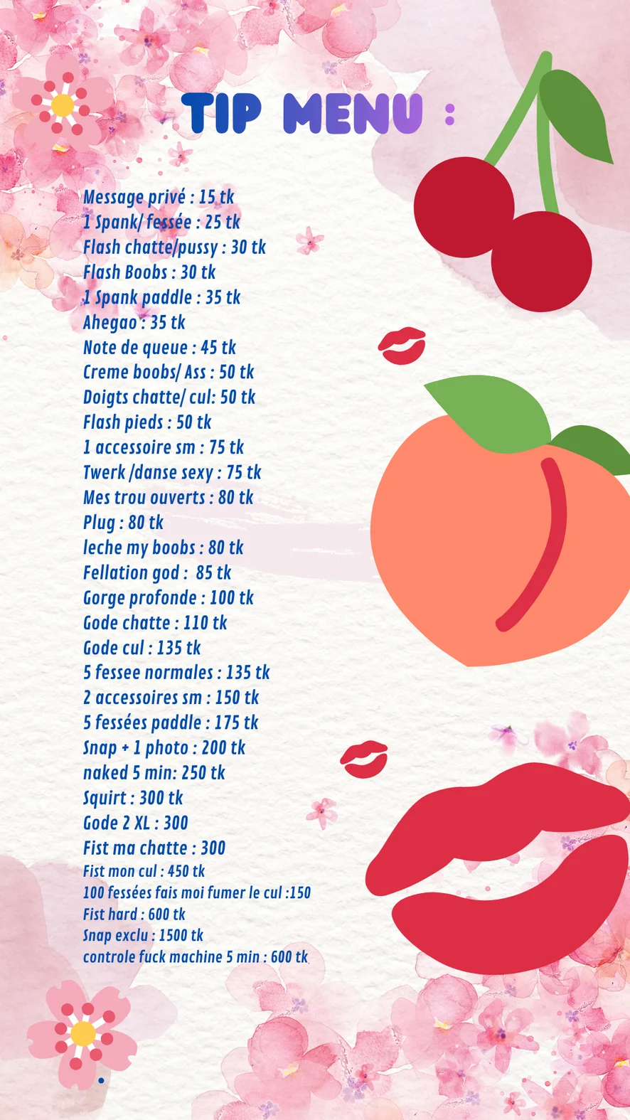 Nipple Toys, Fingering, Spanking, Dildo or Vibrator, Masturbation, Orgasm, Sex Toys, Anal, Doggy Style, Double Penetration, Blowjob, Fisting, Deepthroat, Humiliation, Role Play, Anal Toys, Erotic Dance, Ass to Mouth, Foot Fetish, Hardcore, Jerk-off Instruction, Mistress, Topless, Squirt