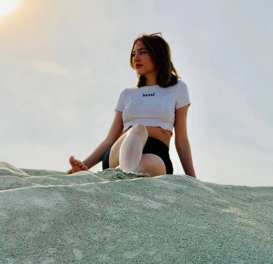 Calm, warm, a little chaotic in a cute way. I’m not trying to be a perfect model, I’m just being myself. If you like simple energy, creativity, and a girl who lives in her own little world sometimes, you’ll feel comfortable here.