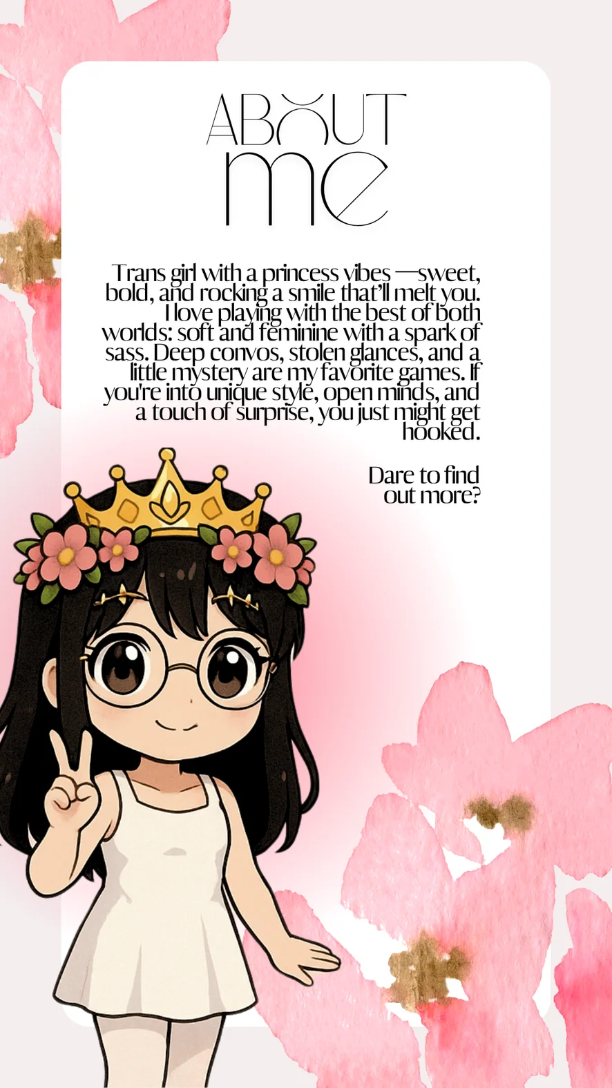 ✨ Trans girl with a princess vibes💖—sweet, bold, and rocking a smile that’ll melt you. I love playing with the best of both worlds: soft and feminine with a spark of sass. Deep convos, stolen glances, and a little mystery are my favorite games. If you're into unique style, open minds, and a touch of surprise, you just might get hooked. Dare to find out more?