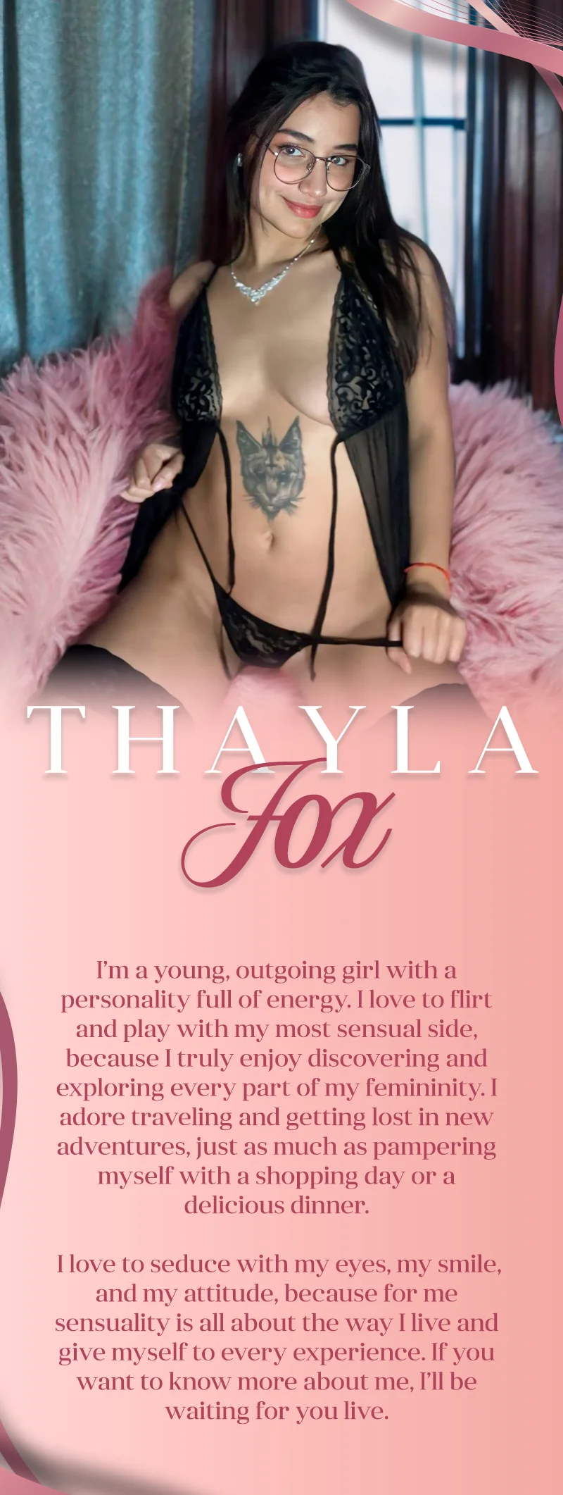 Soy una mujer joven, curiosa y llena de energía, con unas ganas inmensas de descubrir el mundo y disfrutar cada una de sus experiencias. Me encanta coquetear con la vida y dejarme llevar por la sensualidad de los pequeños detalles. Me atraen los gustos refinados, desde una cena exquisita hasta una copa de vino acompañada de buena música que despierte los sentidos. Siempre abierta a explorar, conocer más y vivir nuevas emociones, me gusta disfrutar tanto de lo elegante como de lo atrevido.