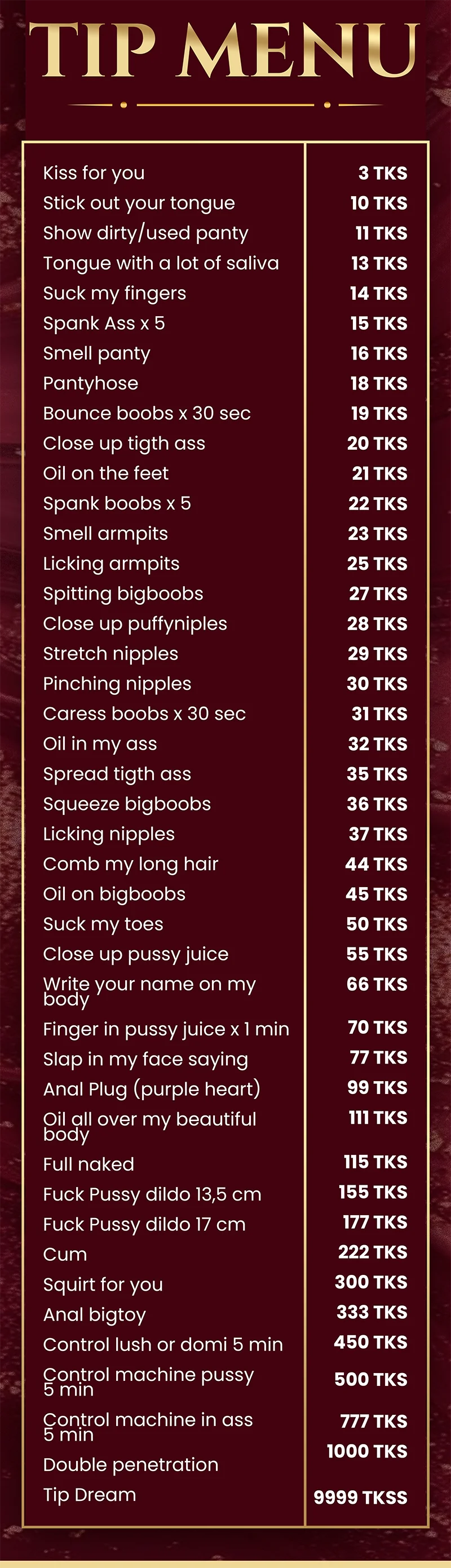 Ahegao, Spanking, Oil Show, Erotic Dance, Striptease, Fingering, Doggy Style, Cock Rating, Dildo or Vibrator, Deepthroat, Sex Toys, Blowjob, Heels, Tittyfuck, Orgasm, Cowgirl, Shower, Dirty Talk, Masturbation
