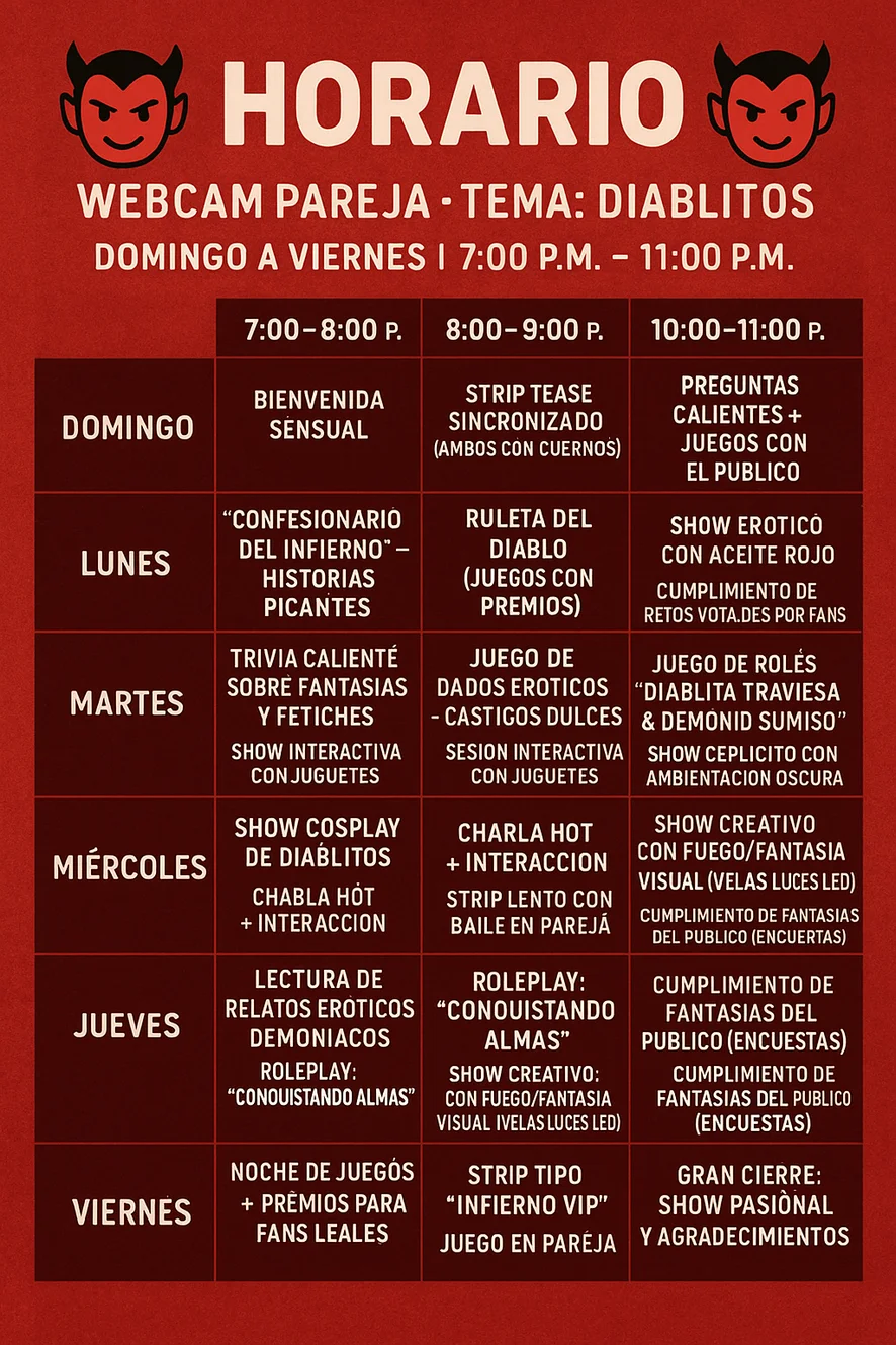 MENÚ HOT DE PAREJA – Webcam Live ¡Bienvenid@ a nuestro show! Atrévete a jugar con nosotros... (20 fichas = 1 USD) SHOWS BÁSICOS Beso apasionado – 60 fichas Topless (ella) – 80 fichas Masturbación suave (ella o él) – 100 fichas Mostrar cuerpo completo (desnudos) – 150 fichas Dirty talk / Juego de roles (3 min) – 120 fichas INTERACCIÓN CON LA PAREJA Sexo oral (ella a él o viceversa) – 200 fichas Posición favorita (a elección del público) – 300 fichas Sexo frente a cámara – 500 fichas Cumshow (con final feliz) – 800 fichas EXTRAS Y RETOS Juguetes (plug, vibrador, dildo, etc.) – desde 150 fichas Striptease lento y provocativo – 120 fichas Bailes calientes – 100 fichas Reto hot sugerido por ti – ¡haz tu propuesta! Privado / Exclusivo Show privado (5 min) – 1000 fichas Control total del show (10 min) – 1800 fichas